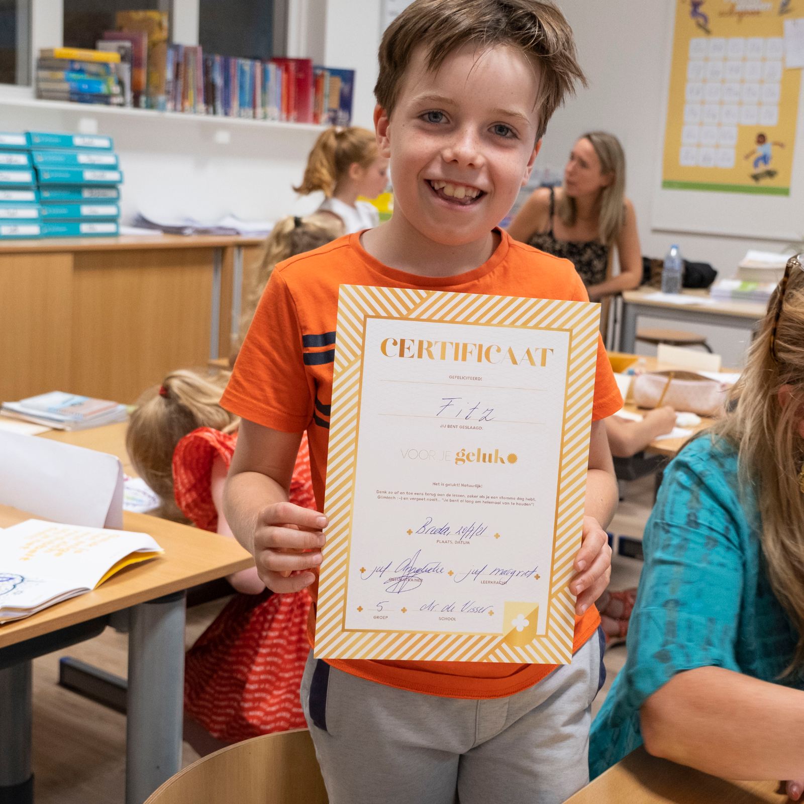 Aan het begin en na afloop van de lessenserie geven de kinderen een cijfer aan hun geluksgevoel. De ervaring leert dat het cijfer na afloop hoger is.